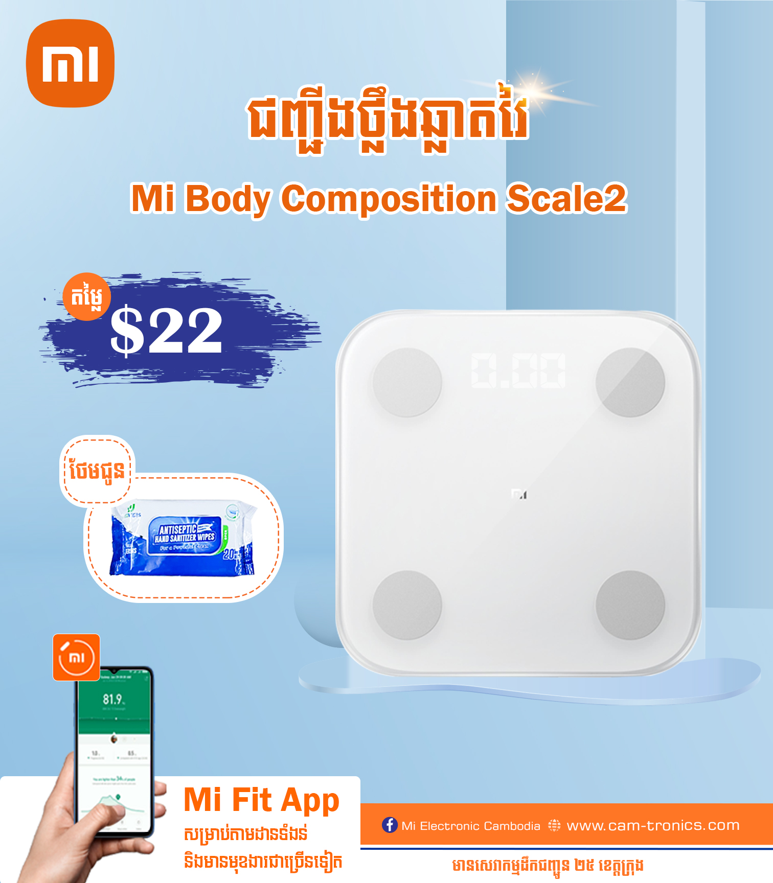 Mi Body Composition Scale 2 តម្លៃ$22 ការរចនារូបរាងស្អាត ស្រាល ទាន់សម័យ មានភ្លើង LED បង្ហាញពីលេខទំងន់ ប្រើ Bluetooth 5.0 , ថ្មពិល 4 គ្រាប់ប្រើបាន 12ខែ មាន G-shaped s...