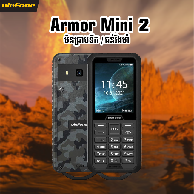 Ulefone Armor Mini2 ទូរស័ព្ទមិនជ្រាបទឹក IP68 មិនជ្រាបទឹក ធន់នឹងធូលី ដូច្នេះអ្នកអាចធ្វើការដោយគ្មានកង្វល់។ ភ្លើងពិល និង មុខងារ SOS ដែលមានភាពងាយស្រួលក្នុងការប្រកាសអាសន្ន កម្លាំថ្ម 2100 mAh ប្រ...