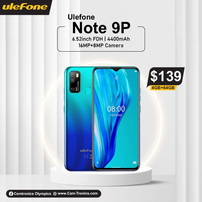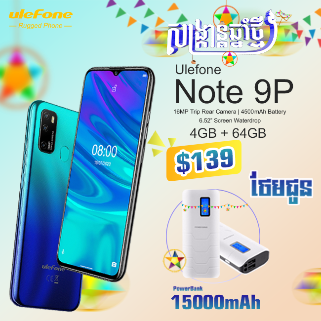 Ulefone Note 9P .អង្គផ្ទុកទិន្នន័យ៖ 4GB RAM + 64GB ROM .កាមេរ៉ា៖ 16MP + 5MP Macro Lens + 2MP ជាមួយកាមេរ៉ាមុខ 8MP .ប្រព័ន្ធប្រតិបត្តិការ៖ Android 10 .ថាមពលថ្ម 4500mAh .អេក្រង់ 6.52Inch HD+ .ការដោ...